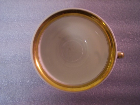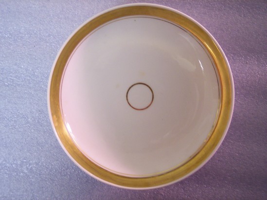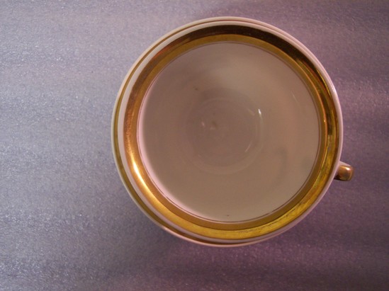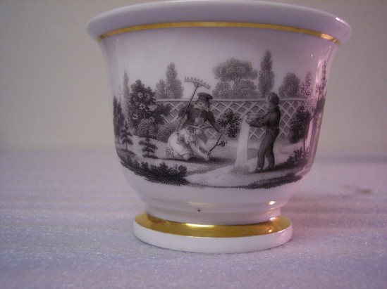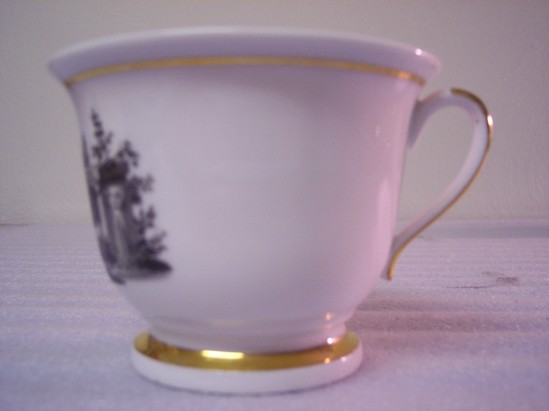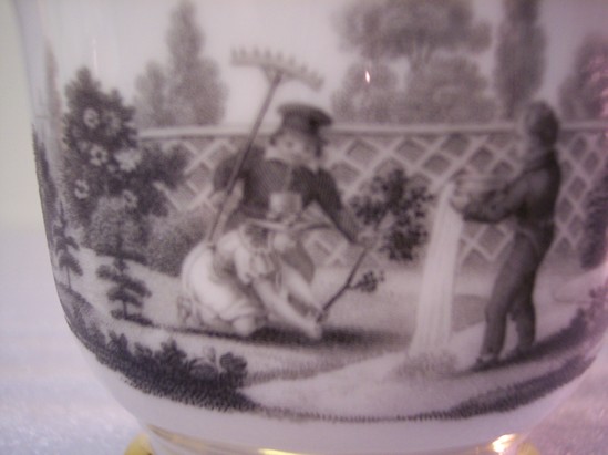 Large, gently flaring cup with c-shaped handle. Thick gold band and thin band on inner rim. Thick gold band on foot and handle. Body decorated with very fine black transfer printed scene of 2 boys and a girl by a lion-headed fountain in a garden planting a tree. Saucer is deep, with wide and narrow gold band on rim with thin gold circle in the center. Both pieces marked with incised "t," probably a gilder's mark, as they were paid by the piece.