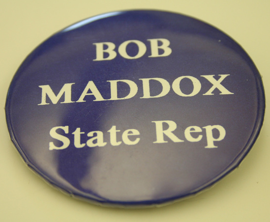 Campaign button. Blue background with white lettering "Bob/Maddox/State Rep." Message on paper, which is covered with plastic cover. Both paper and plastic are pressed into metal backing. Pin closure on back of metal.