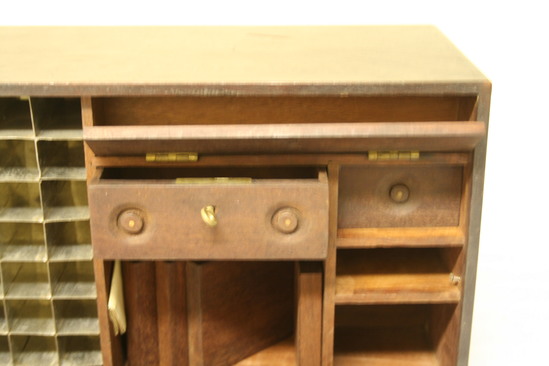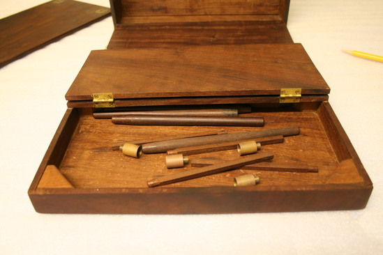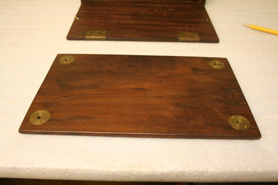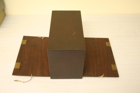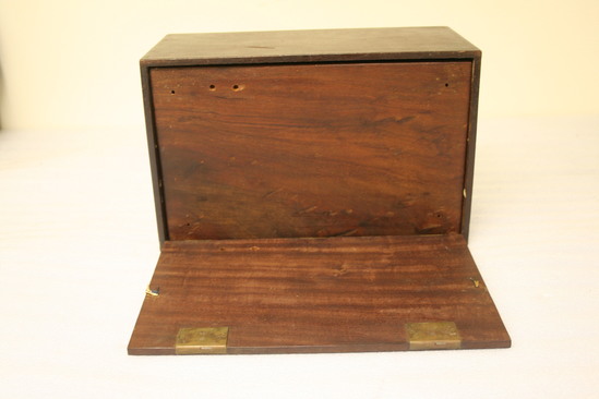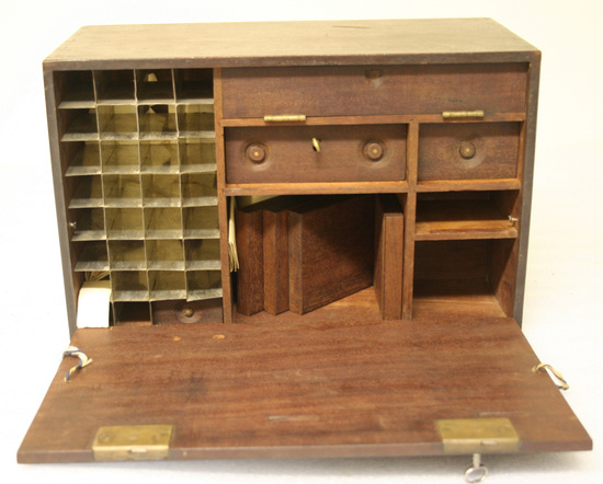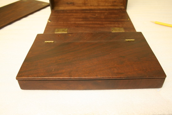 Traveling desk - small rectangular box - two sides hinged. One folds down to reveal drawers and compartments. Series of small metal cubbies. Other side hinged to reveal false bottom. When removed box underneath with hinged lid. Hidden compartments within desk once box removed. Both sides lock with small metal key