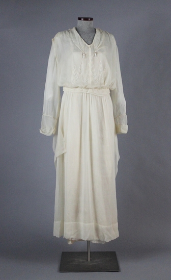 Sheer cream colored silk dress; skirt ankle length or slightly higher; lined with cream silk; linen waistband on inside of dress; long sleeves with material turned back at cuff; extra panel of fabric on each side of waist; beading and embroidery on front of dress in zig-zag pattern - white beads with cream silk thread; dress fastens with snaps down left side of bodice; shawl style collar with beaded tassel on each side