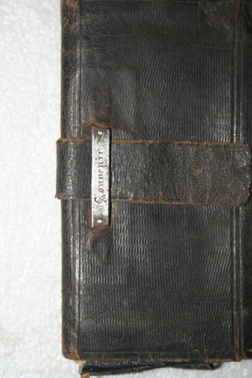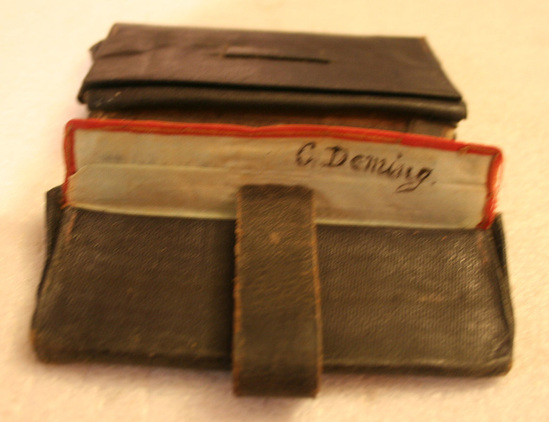 Black leather trifold wallet lined with green silk. Three interior pockets. Top pocket has additional pocket with flap closure. Written on underside of flap in ink "C. Deming" Middle pocket is accordian style with envelope pocket on top. Enclosed in wallet are Charles Deming's calling card and a receipt. Leather strap to close wallet. Metal band across top of strap, engraved "Souvenir" Pocket for pencil inside of wallet with pencil enclosed.