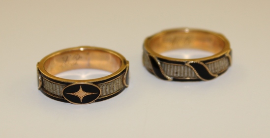 A: Gold band with white hair inserted into panels. Panels divided by black enamel ovals with gold star and ovals inlayed alternatively. Engraved on inside of ring "H.C" B: Gold band with white hair inserted into panels. Panels divided by black enamel leaves. Engraved on inside of ring "E.C"