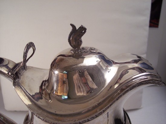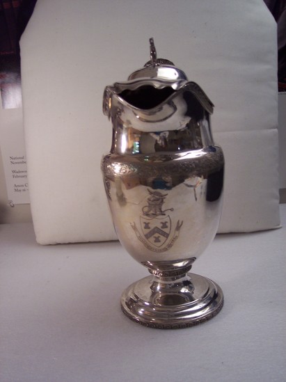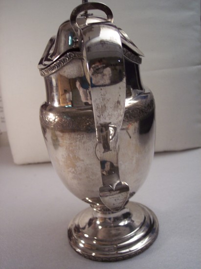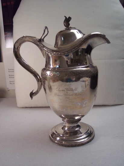 Round base with chased scallop shell band, stepped to short round foot, with scallop shell slanted collar; egg shaped body, with neck band of floral and leaf engraving, tapering to open spout top with scallop shell rim. S-shaped handle, with oval thumb piece, on top and heart shaped S curved terminal. Top with loop thumb piece of scallop shells at hinge, domed at center with cast squirrel on bed of acorns as finial. Decorated on front with Wolcott crest, and inscribed in script on side "Oliver Wolcott to Laura Wolcott Gibbs 1810" Oliver Wolcott Jr. gave this to his daughter Laura on the occasion of her marriage on Dec. 27, 1810 to Col. George Gibbs of Newport R.I. And afterwards Sunswick, NY. Her dates are 1794-1870. Hallmark on bottom in script "Wthomson" in plain rectangle