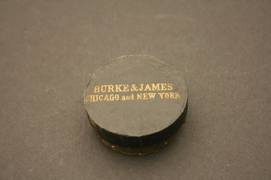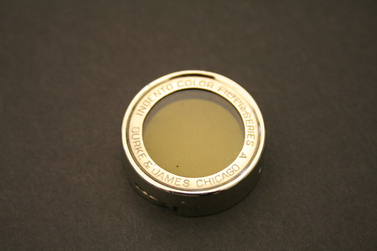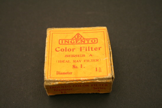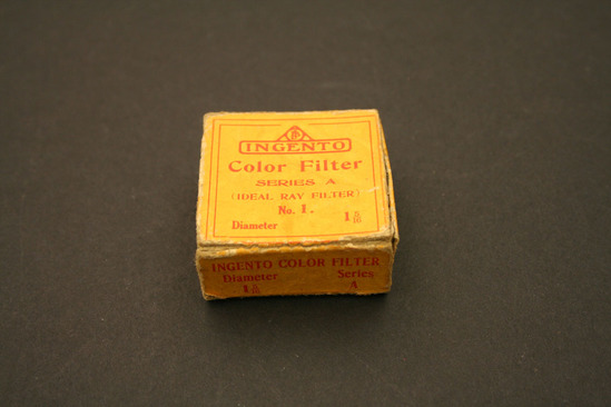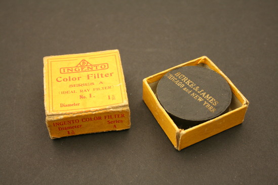Two containers - exterior box and case containing filter A, B - Exterior Box - yellow cardboard with red print; lid slides around bottom; "Ingento/Series/A/Burke & James/Inc./Chicago" on one side "Ingento/Color Filter/Series A/(Ideal Ray Filter)/No. 1/Diameter 1 5/16"" on other side C,D - Case for Filter - round leather, bottom half covered in black linen; interior of bottom lined with purple velvet, in gold on lid "Burke & James/Chicago and New York" E - Filter - round silver metal band with yellow glass in center, metal raised on one side with three cut outs around side to affix to camera lens