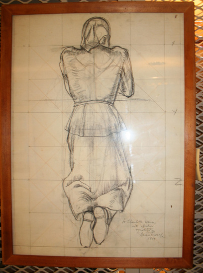Heavy grade 100% white cotton drawing paper with hand drawn 3 1/4" grid cross hatched by brown pencil. Central figure is a woman wearing a kerchief on her head kneeling with her back to the viewer. She is wearing a straight skirt and belted jacket. The soles of her shoes protrude from her skirt. Written on front of drawing, "To Charlotte Warren with affection and gratitude Austin Purves 1950" Wooden frame with glass.