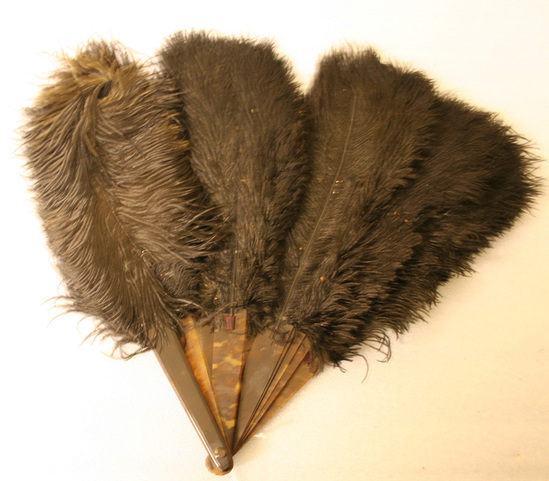 Black ostrich feather fan with tortoise shell sticks. Dark maroon silk ribbon woven through top of fan. Brass pin at bottom of sticks.