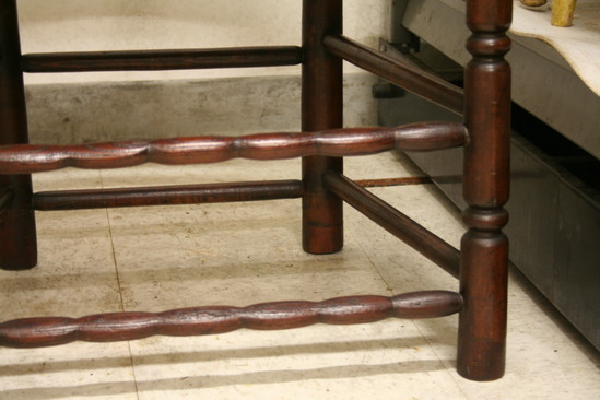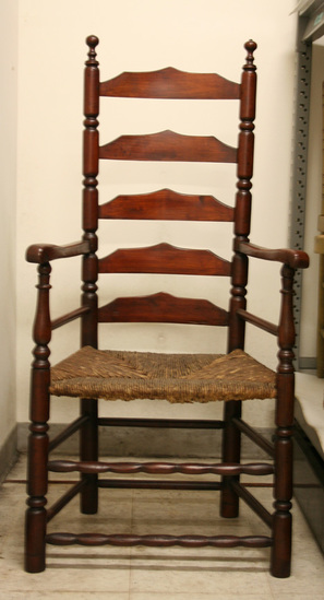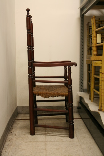 Rush seat. Front legs and back uprights have sausage and ring turnings. Curved arms, sausage-turned double front stretchers, plain round double stretchers on sides and back. 5 shaped slats and round arm stretchers.