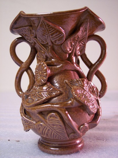 Ring base with full body and concave neck. Decorated with large applied leaves and flowers with two 8-shaped handles. Lip has 4 scallops. Brown matte glaze.