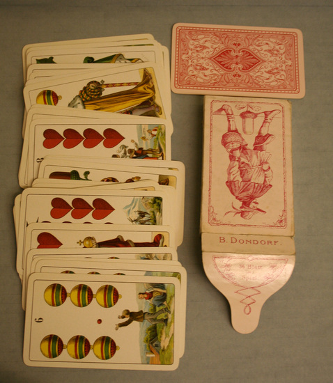 Deck of playing cards with 36 cards total. Cardstock with clear coating. 4 suits represented by symbols of leaf, bells, hearts and acorns. Each card has lithographic image on card along with suit symbol. Back side of card red and white with intricate desing of scrolled lines and flowers. Cards held in cardstock box. Design on one side in red and white of man holding a basket. "B. Dondorf" "No. 313 Deutsche Spielkarte" and "Frankfurt A.M." printed around outer edges of box.
