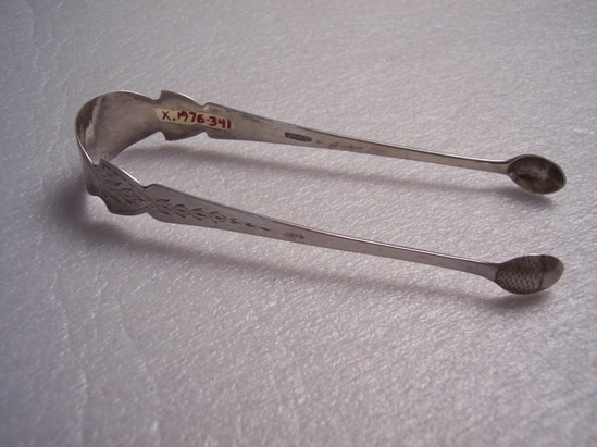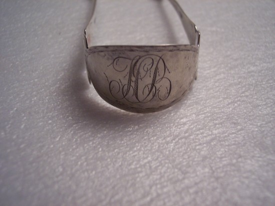 sugar tongs, small oval ends with etching on top half - scalloped design. Floral etched design on arms of tongs and around edge of neck. "TCB" engraved on top of tongs where two arms meet. Hallmark "WWARD" on inside of each arm.