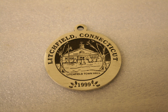 Oval/round pewter Christmas ornament with raised decoration depicting the Litchfield Town Hall. The central image is surrounded by a band reading "Litchfield, Connecticut 1999" The image is the same on both sides.