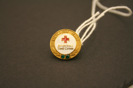 Small round American Red Cross, gold metal pin. Center of pin has raised white circle with a red cross and printed in gold lettering "American Red Cross" in center. Above white circle in raised gold lettering "Sixty-Five Years" Underneath circle are two small emerald green stones set into pin.