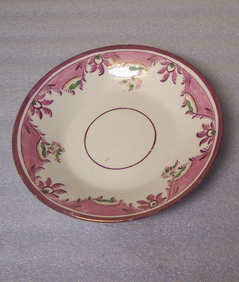 Pink luster highlights and floral swag motif in pink with green touches. Floral motif is on outer edge with a thin, pink circle in the center. Wide, pink luster band around the edge.