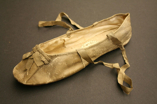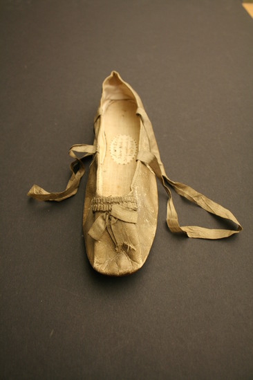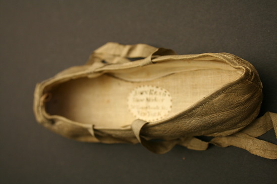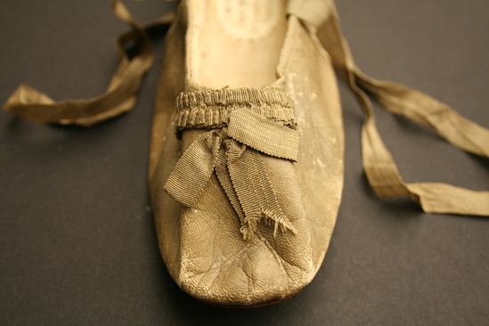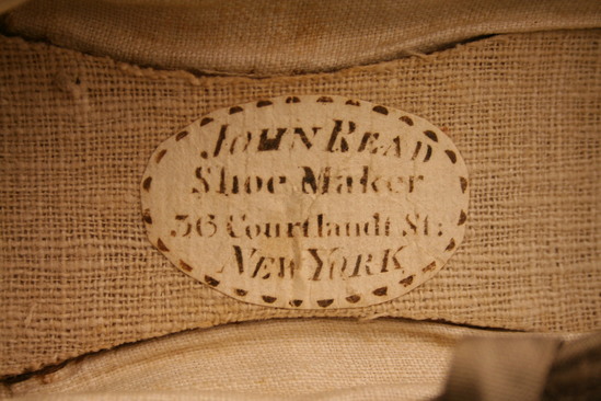 Grey/brown kid leather slipper with bow on front and ties on side; brown leather sole with round toe; inside labeled "John Read/New York"