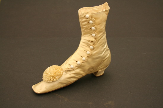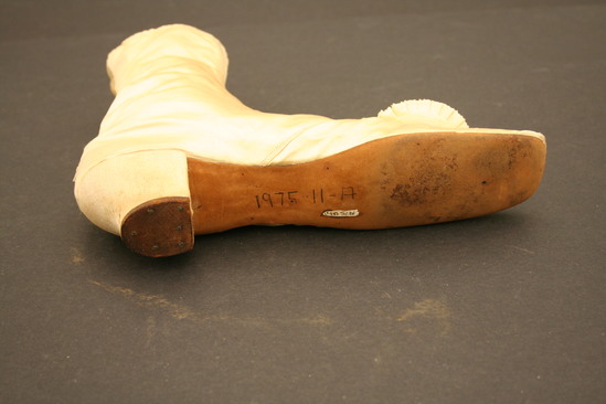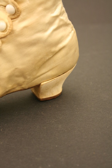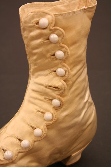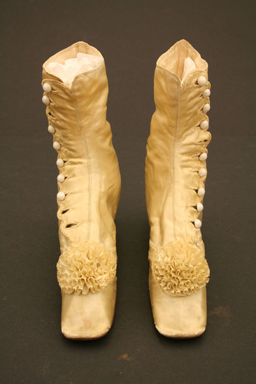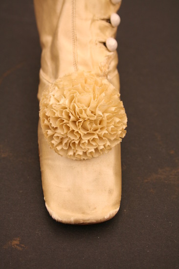 Silk wedding boots; button up side with white glass buttons; scalloped edge on button hole side of closure; white silk pompom on top of toe; leather soles; short heel; squared off toe; body of boot lined with linen