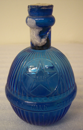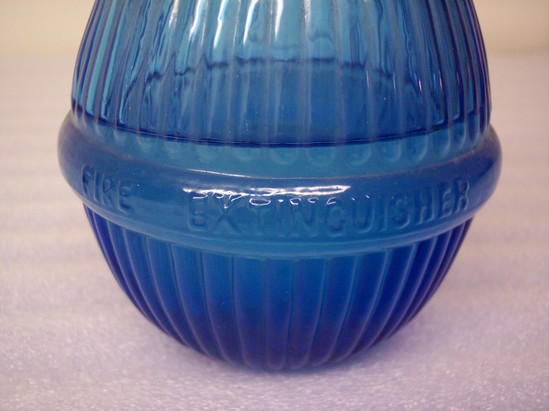 Round fluted bottle with neck. Blue glass. Embossed on protruding band at middle "Harden's Hand Grenade Fire Extinguisher" Above band is an embossed circle with enclosed star. Inside star is embossed, "Star" Bottle is still sealed and contains liquid/ Indentations in base.