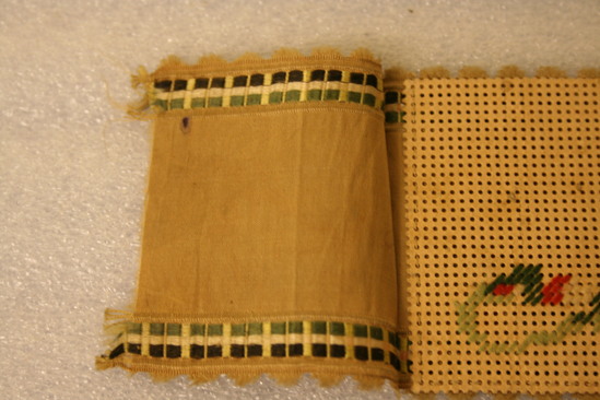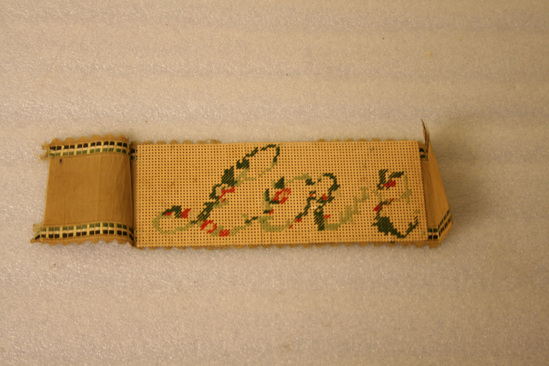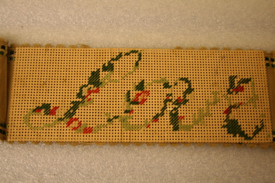 Brown paper punch card with "LOVE" in script. Stitched over in colored wools - reds and greens. Brown silk ribbon with green border and scalloped edge attached to back of punch card with excess hanging out on each end.