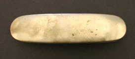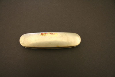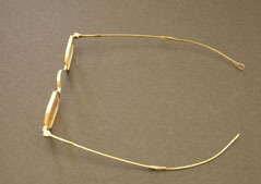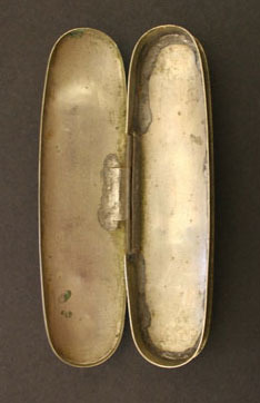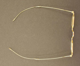 Glasses have octagonal lense frames, hinged bows that are extendable. Bow end in loops. "C - 10 x A.N. Kirby" stamped on inside right bow. "16" stamped on outside left bow Case is short oval, hinged, no marks