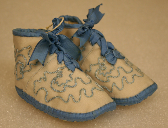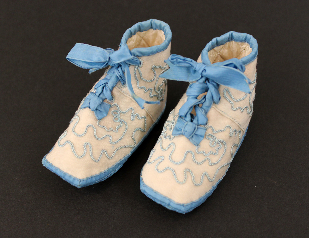 Pair of off-white wool child's shoes / booties; square toes; blue silk ribbon trim around ankle and sole; blue ribbon lacing; embroidered with blue stippled chain stitching; off-white quilted silk lining; matching fabric soles