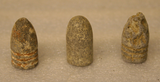3 lead cartridge cases. Cylindrical shape, domed top. Ridges cut around circumference of case around bottom. Coroded and rusted