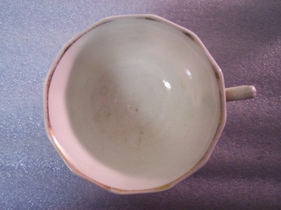 Twelve, white teacups with segmented handles, ring bases, and 12-paneled flared sides. Gilt floral motifs circle the outside.