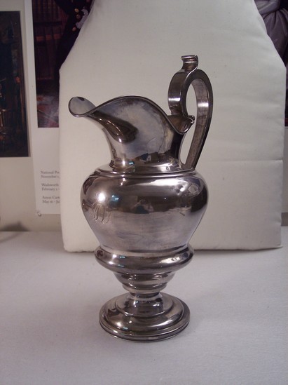 See 1939-03-9 for matching piece. Large silver pitcher, handle on one side. Engraved on front under spot with "JD" for Julius Deming. Engraved on side "This piece of family silver/is presented to/Edith Howell Perkins/on occasion of her marriage/in remembrance of her Great-Grandfather/Julius Deming/April 25, 1900"