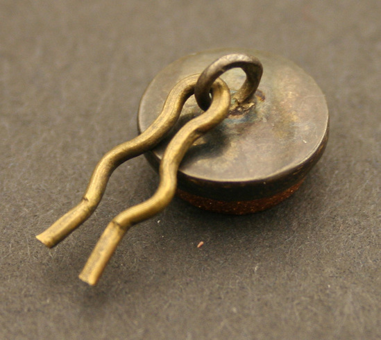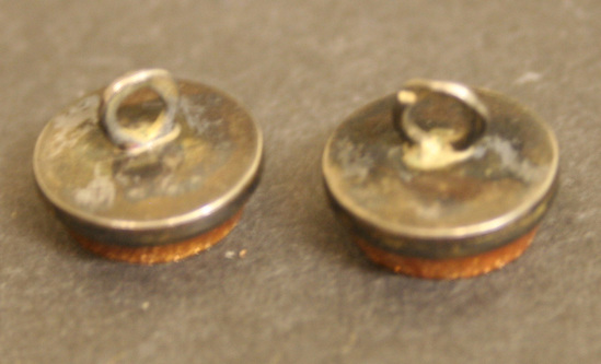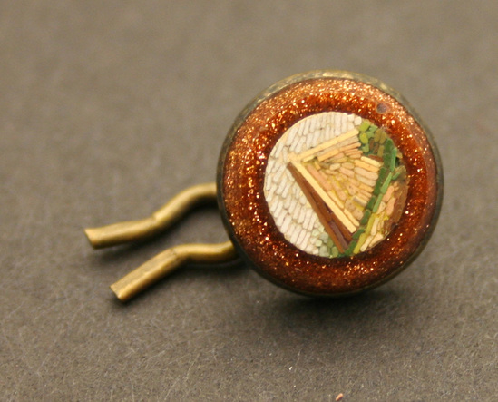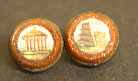 3 cuff link buttons. Round shape with gold setting. Eye on back of each with bent piece of bronze wire through back of one button. Face has gold stone board with micro-mosiac center of classical buildings. Each button has different mosaic design.