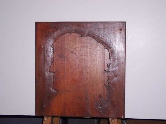 Stipple on pine stained brown of Indian head in profile. Mr. Pikosky's original design.