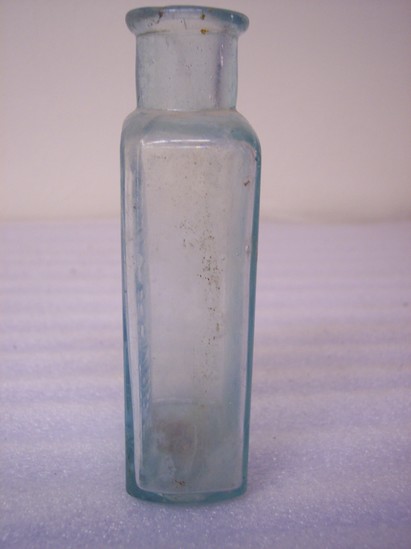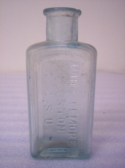 Blue/green glass bottle with out stopper with raised lettering on one side "Whittemore/Boston/A.S.U."