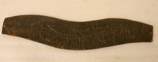 Shaped piece of leather. Rectangular with a dip in the center. Hole at each end of leather. The front has a raised design of a spread eagle above a cannon and banners with swords and partoons on either side. "George Gaylord - Norfolk" written in ink on back side.