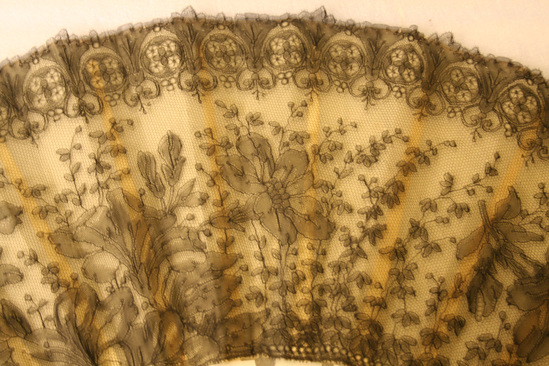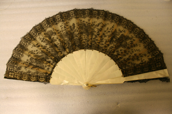 Black lace fan with floral design and plain net backing. Mother of pearl sticks with glass faceted stone pinning sticks together at base and brass handle.