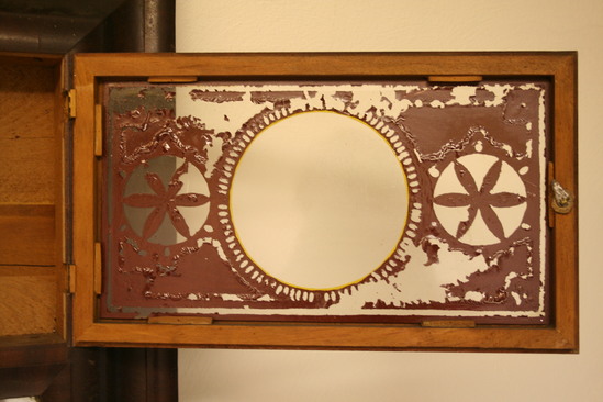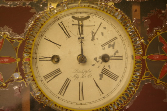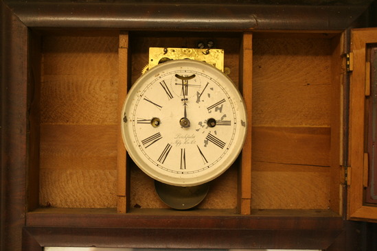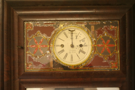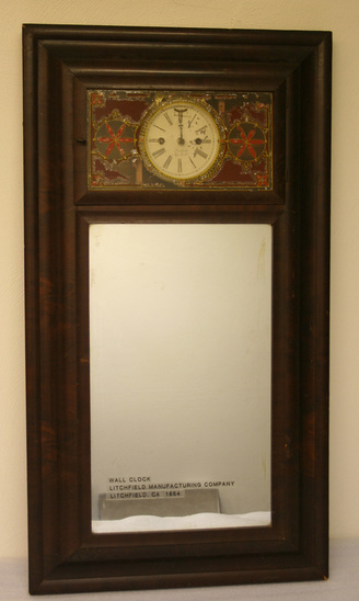 Mirror with clock by Litchfield Manufacturing Company. Heavy mahogany veneer frame with 1" convex edge, 2 1/2" cyma curved border with 3/4" concave border on mirror. 7/8" convex frame on door of clock. Red and yellow reverse painted glass door. Key and hole on left hand side. 2 hinges on right. Yellow stars in circles on either side of dish shaped tin clock face. Face painted white with black roman numerals. Second hand and s/f indicator. One hand missing. Brass works inside boxed from back. Iron hanger on back of clock box. Cardboard backing to mirror.