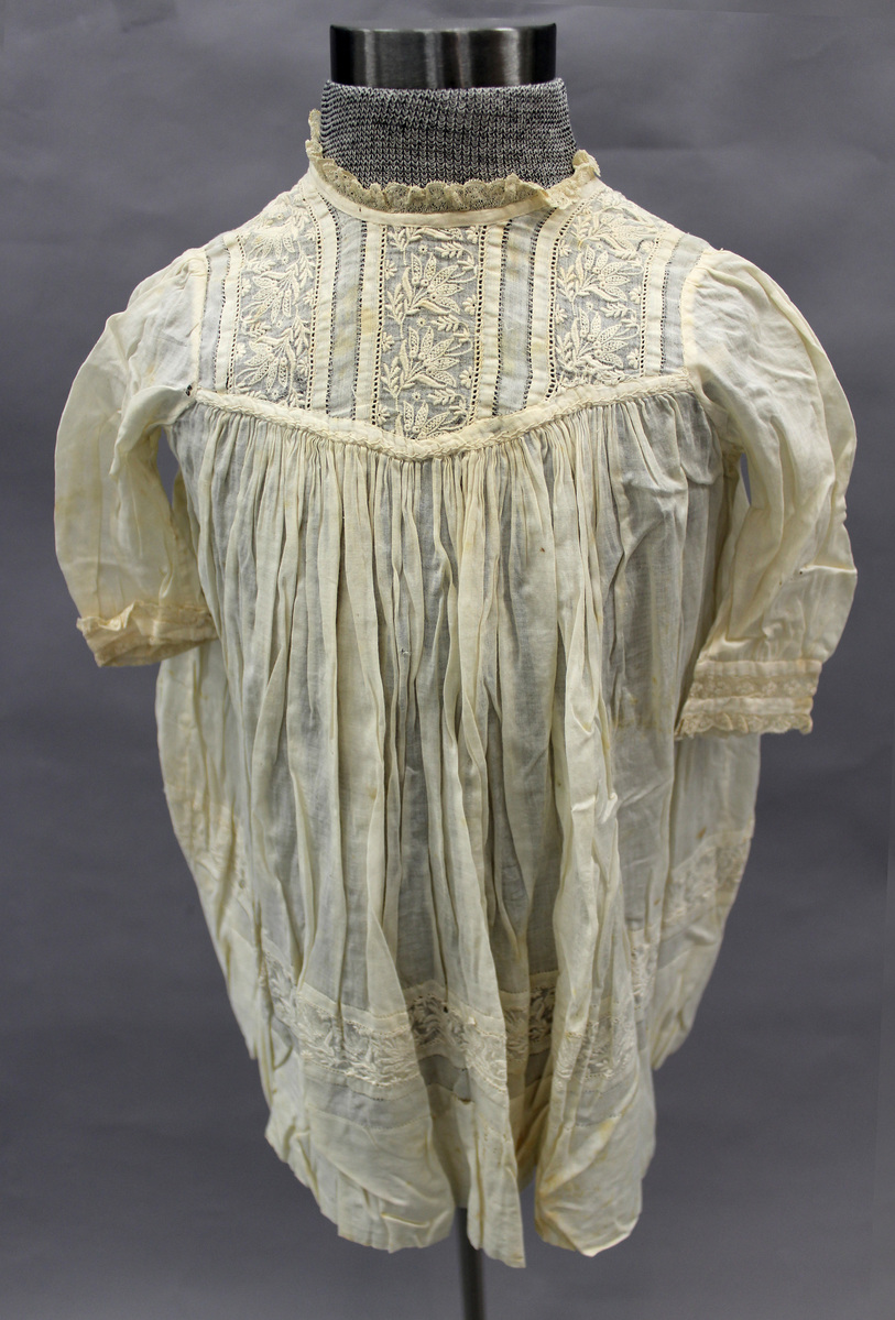 White sheer cotton child's dress; long sleeves with lace cuffs; lace trim at neck; V'd center front and back yoke with lace insertions and drawn work; round neck with lace ruffle; lace insertions at drawn work at hemline; center back opening with three buttons; machine and hand-stitched