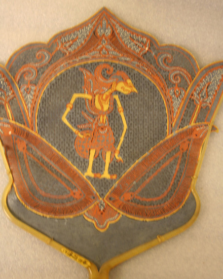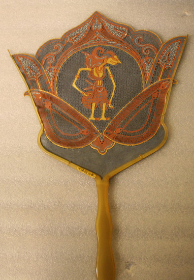 Fan or Hand Screen. Handle made of translucent tortoise shell. Single, rigid solid handle. Two thin arms extend from top of handle up along sides of fan. Body of fan made of heavy parchment paper painted blue. Paper pierced creating design of solids and voids. Some areas painted pink. Figure in center with Egyptian eye, elaborate head dress and skirt, holding a shield. Body painted gold.