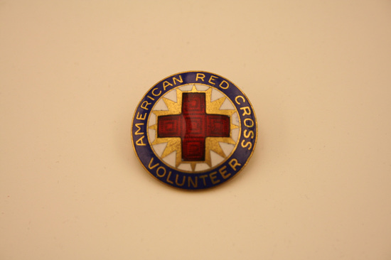 Round pin with gold plated back. Navy blue border. Printed in border in gold lettering. "American Red Cross/Volunteer" red cross in center of pin. Gold star behind red cross