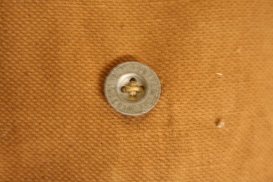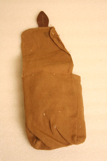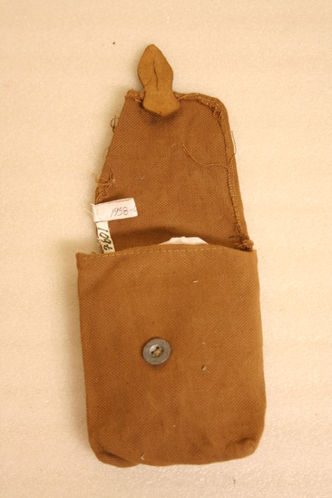 Small brown pouch, courses weave, flap on front secured by leather tab and metal button. Squared off bottom