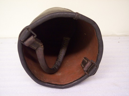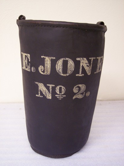 Leather fire bucket, painted black. Handle attached to top of bucket with round metal rings. Painted on side of bucket in white block lettering "E. JONES No. 2"