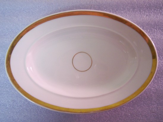 Oval serving dish with wide gilt band on edge. Small, thin gilt circle in the center.