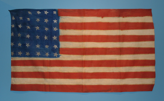 Homemade American Flag. Body of flag made from piece of linen cloth. Red stripes painted with vermillion paint and the blue square painted with indigo paint. The 36 stars were hand cut from silver tinsel paper and glued onto flag.