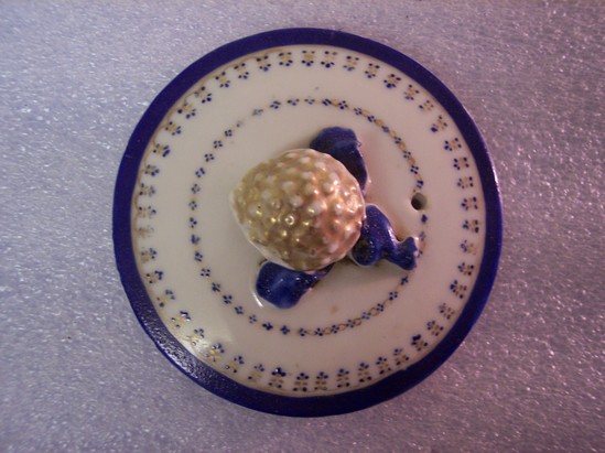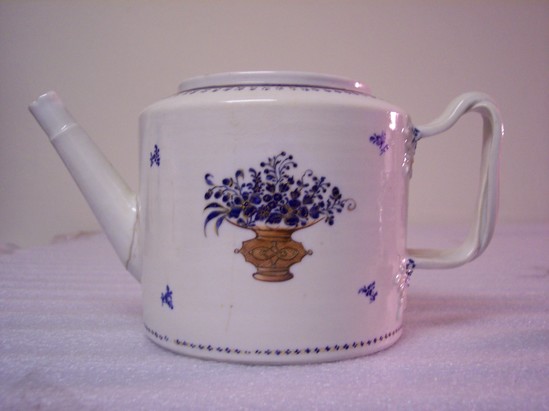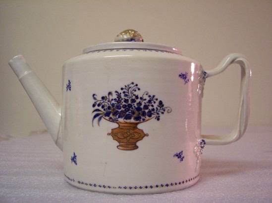 Drum-shaped teapot (A) with twisted, grooved handle having four leaves where it attaches to the body. Straight "bamboo" spout, flat top, and low neck collar. Flat, round lid (B) with pomegranate and three leaf finial. Finial is gilt with blue leaves. Decoration is of tiny blue dots and a gold chain band on base. Each side has brown Asian flower pot containing blue flowers flecked with gold. Four tiny sprays at corners of side panels, leaf handle ornaments highlighted with blue and gold. Edge of cover and top have wide blue bands with gold edges and gold scalloped line with gold and blue floral pendant. Base line repeated on cover.
