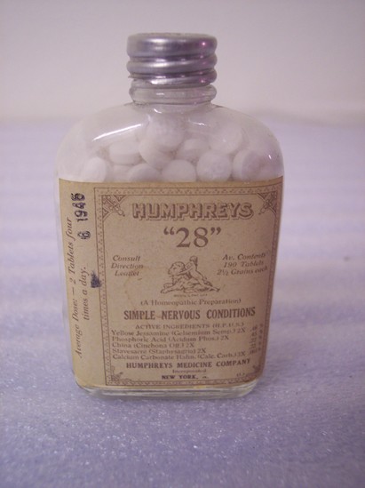 Clear glass bottle with label for Humphreys #28 pills, a homeopathic preparation for "Simple Nervous Conditions" 190 White pills "Humphrey's Medicine Company, Incorporated/New York"