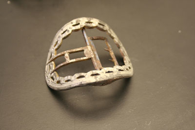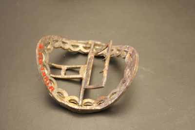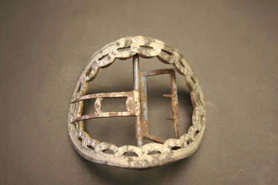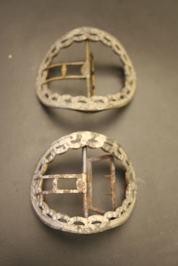 Pair of shoe buckles. Oval shape with rounded body. Interior edge of buckles scalloped. Center rod with two hinged tongues. One tongue is U shaped with two long thin prongs. Other tongue is square shaped with two small prongs facing center rod