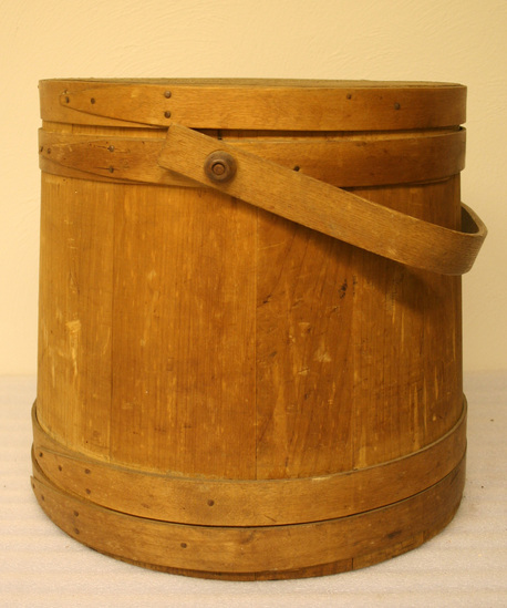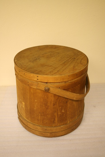 Wooden bucket with lid. Sides made of martised pieces bound on outside with three stripes of wood, tacked in place. Flat handle on wooden pivot. Top and bottom single round piece of wood.