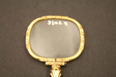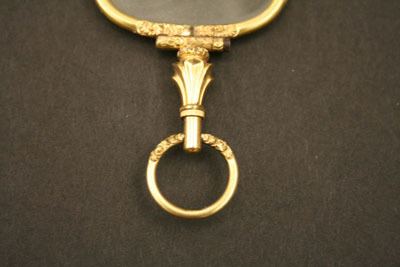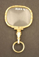 Frame and ring made of carved gold, supporting stem of cast gold. Single lense. Used for magnification