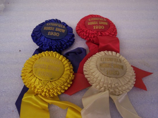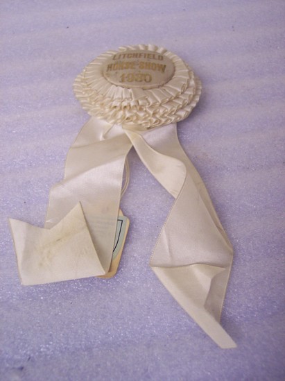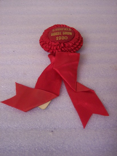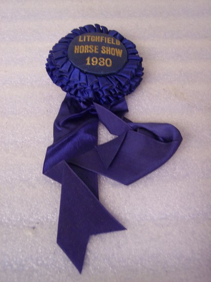 Silk ribbon, rosette at top. Printed in center in gold lettering "Litchfield/Horse Show/1930" Two blue ribbons extend from bottom of rosette. Makers label glued on back of rosette with metal hook extending from back of rosette. A - blue silk ribbon B - red silk ribbon C - Yellow silk ribbon D - White silk ribbon