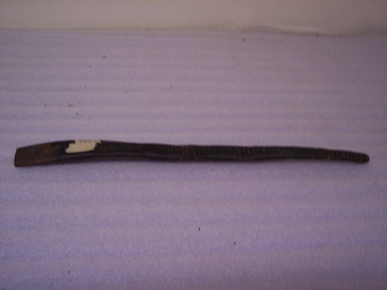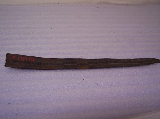Long, thin, leather sheath. Opening at top. Stitched down back. Comes to a point at bottom
