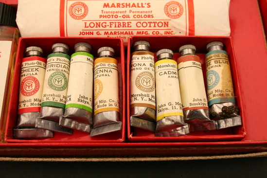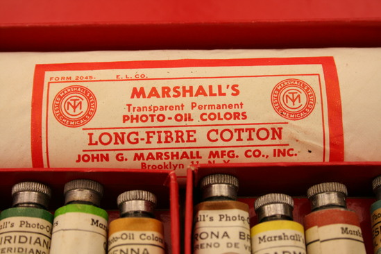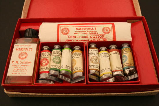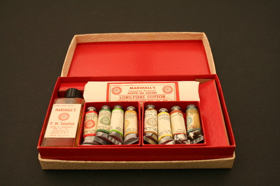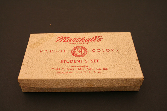 Cardboard box - white textured paper on outside, hinged lid, in red lettering "Marshall's/Transparent/Photo-Oil Colors/Student's Set/USA" Interior lined in bright red, glossy paper, various compartments created by cardboard inserts; on bottom is collection of wooden sticks - pointed at one end; bundle of long fiber cotton wrapped in paper - in red lettering "Marshall's/Transparent Permanent/Photo-Oil Colors/Long Fiber Cotton/John G. Marshall Mfg. Co. Inc./Brooklyn 11, NY" Clear plastic bottom with black screw lid - yellow liquid inside, white paper label with red lettering "Marshall's/P.M. Solution/John G. Marshall/Mfg Co. Inc./167 North 9th St./Brooklyn 11, NY/Made in USA" Two cardboard containers, each with four small tubes of paint; metal containers with screw on caps - paper labels that identify colors - Cheek (red), Virdian-B (green), Green, Sienna, Flesh, Yellow, Verona Brown, Chinese Blue