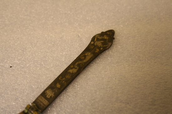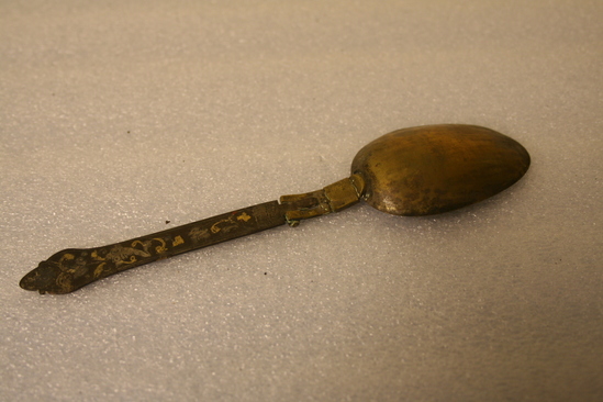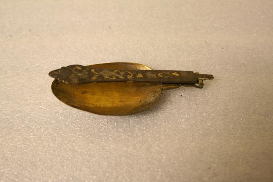 Folding spoon; oval shaped bowl with metal handle. Handle hinged just below bowl to fold over. Etched design on handle of spoon. Handle also shaped slightly, comes to rounded point at end.