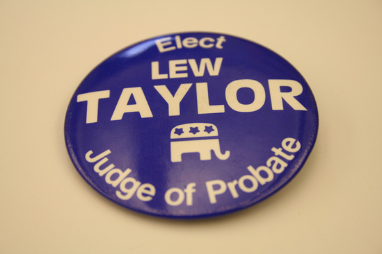 Round metal pin-back button with clasp on back. Blue, in white lettering, "Elect/Lew/Taylor/Judge of Probate" with republican symbol - elephant with three stars