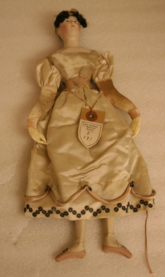 Doll with papier-mâché head and shoulders, real hair on head. Doll is dressed in white silk dress with puffed sleeves, straight neckline and skirt decorated with pink satin loops on hem and sequins, piece of net remain. Hair is braided on head with a series of curls across brow. Doll has ballet slippers on feet and leather gloves on hands. The hands are sewn to the skirt as if lifting the hem of the skirt upward. A pink silk cord is sewn to the back of the waist of the doll and by holding cord, doll will stand in a ballet position